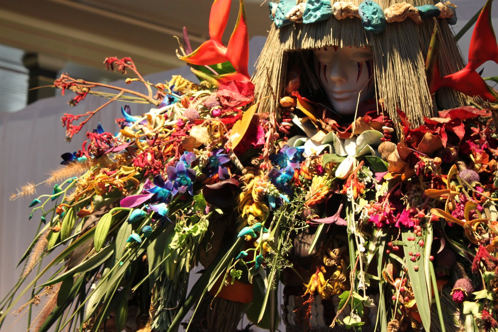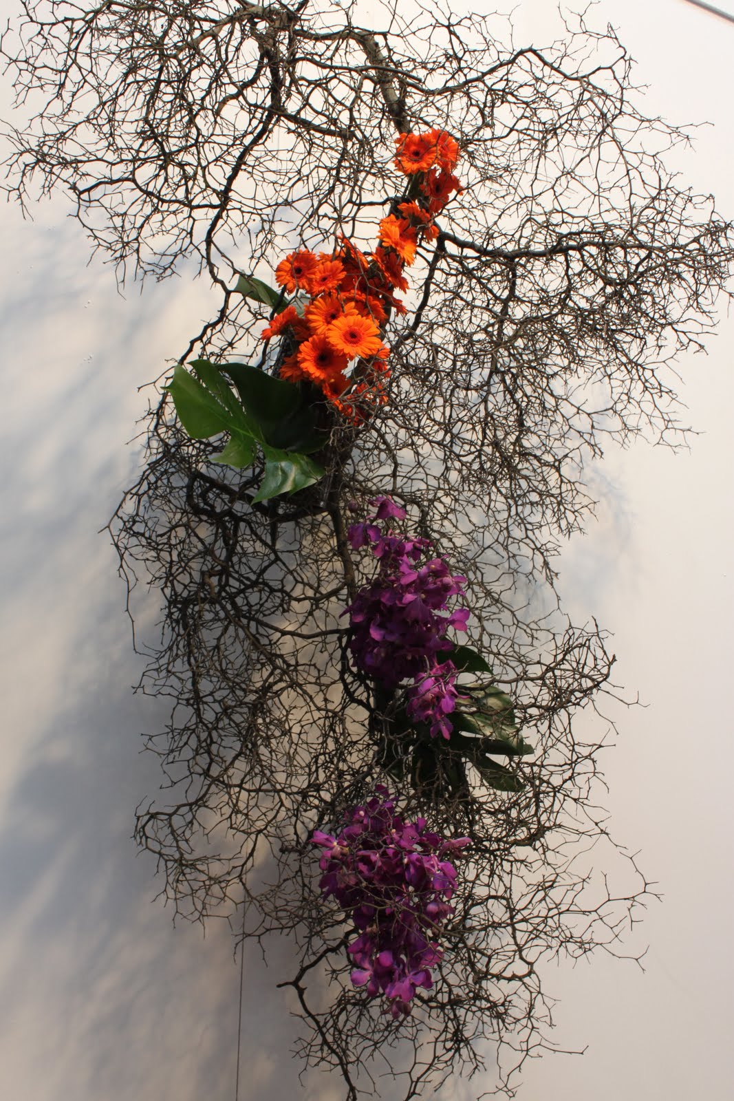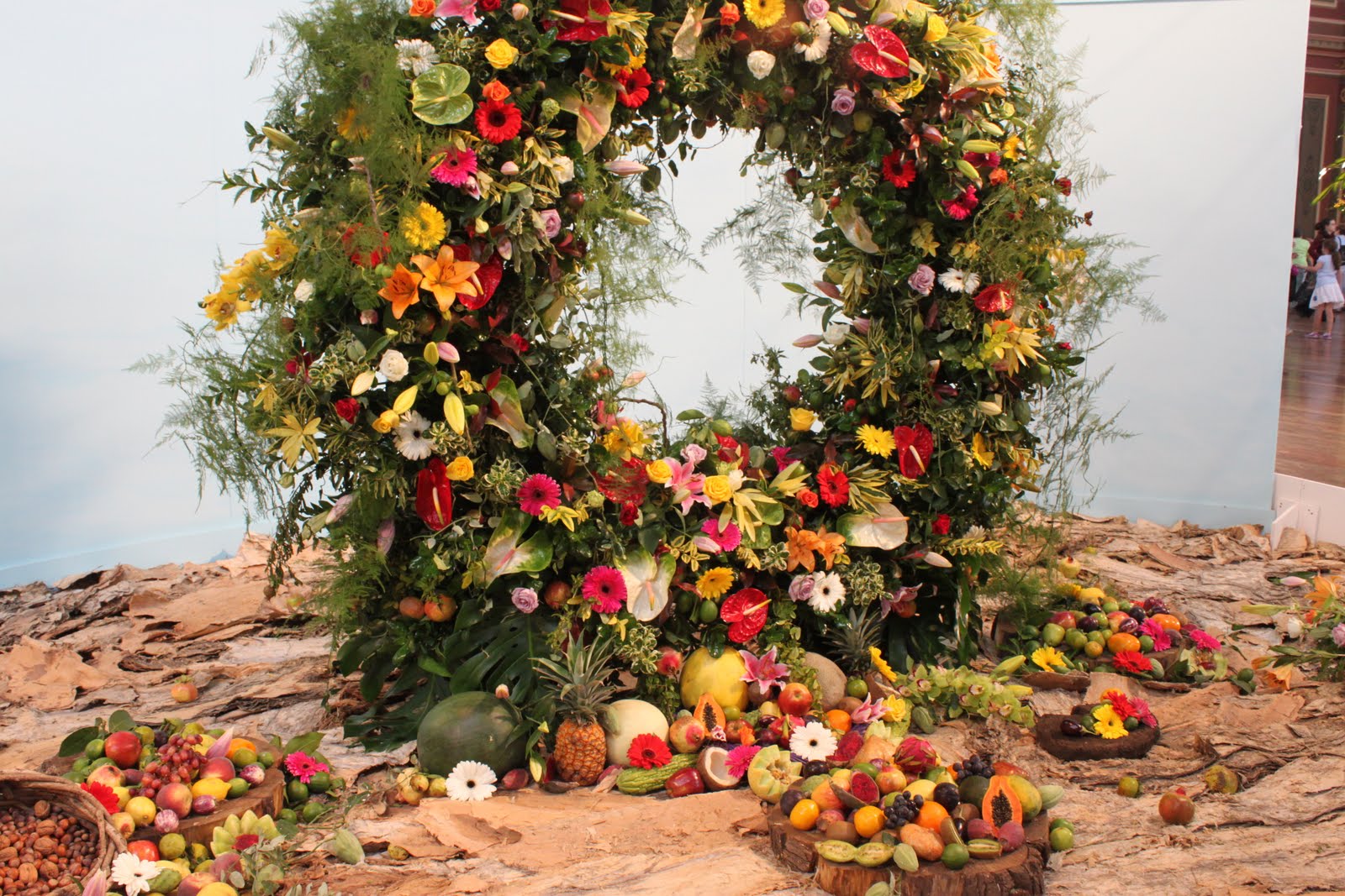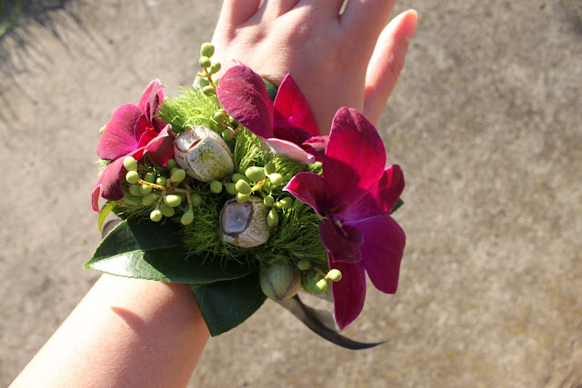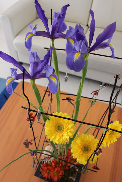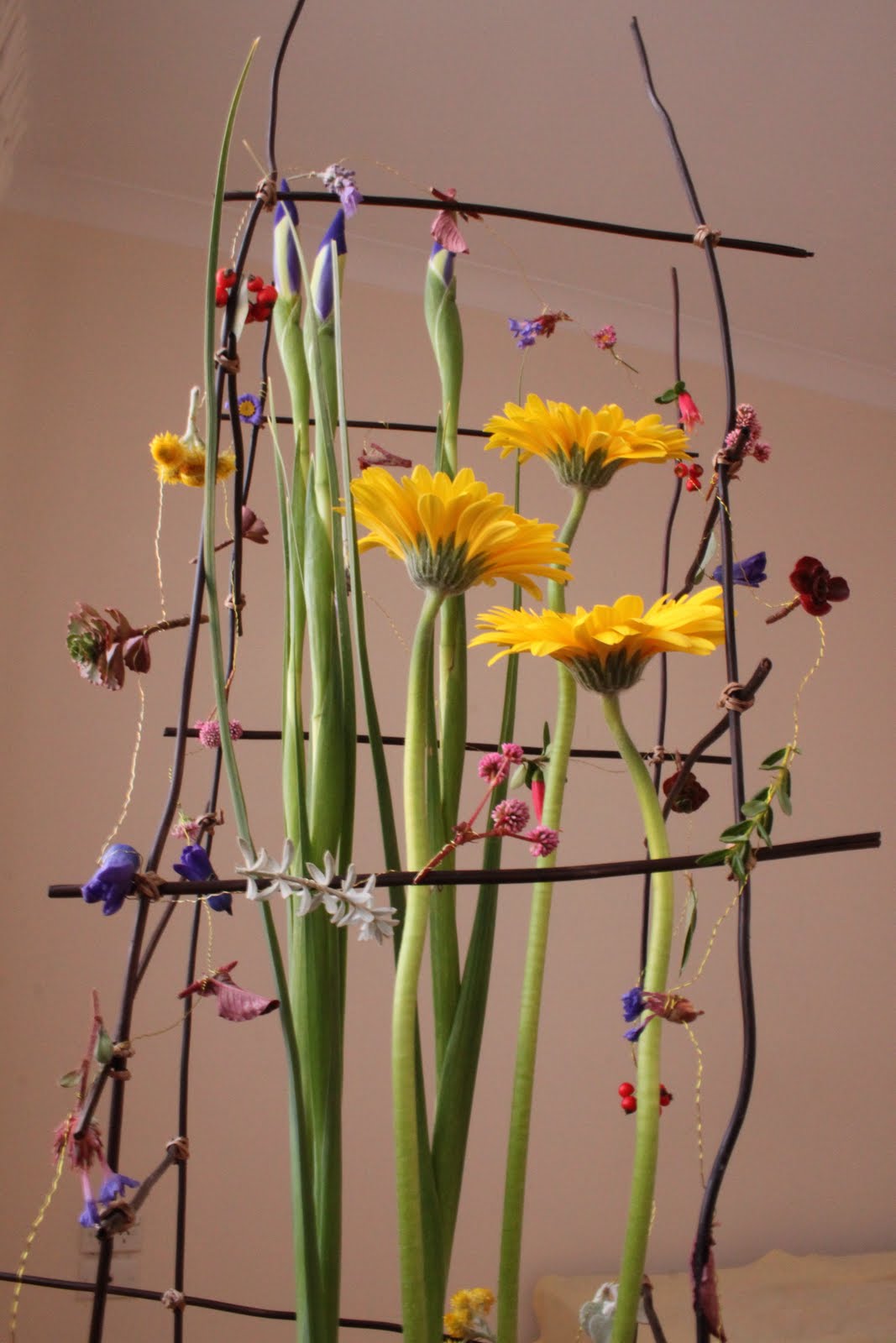 Iris, Gerbera, Chrysanthemum, Moss, Paperbark, Fern Stalks, flower chains with various flowers and leaves