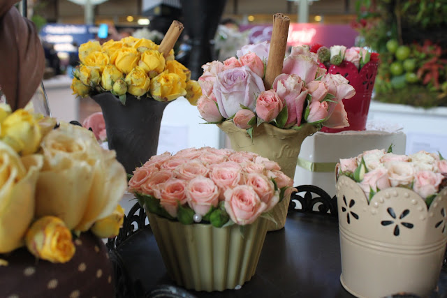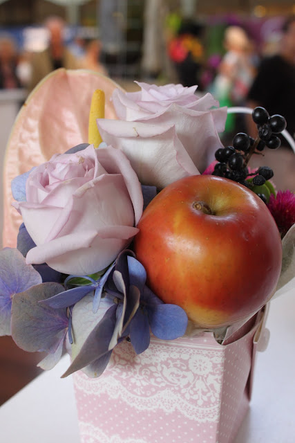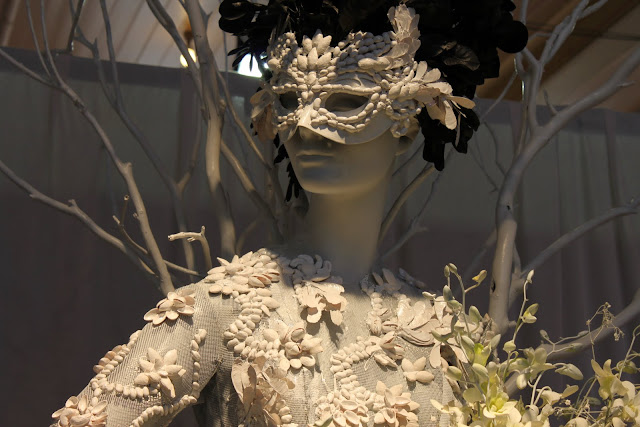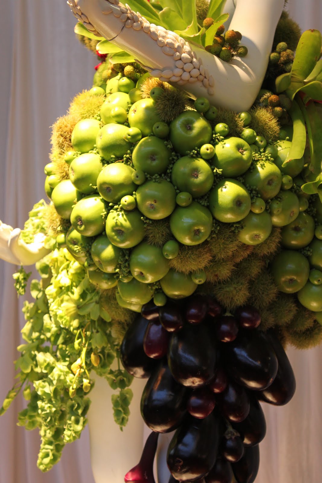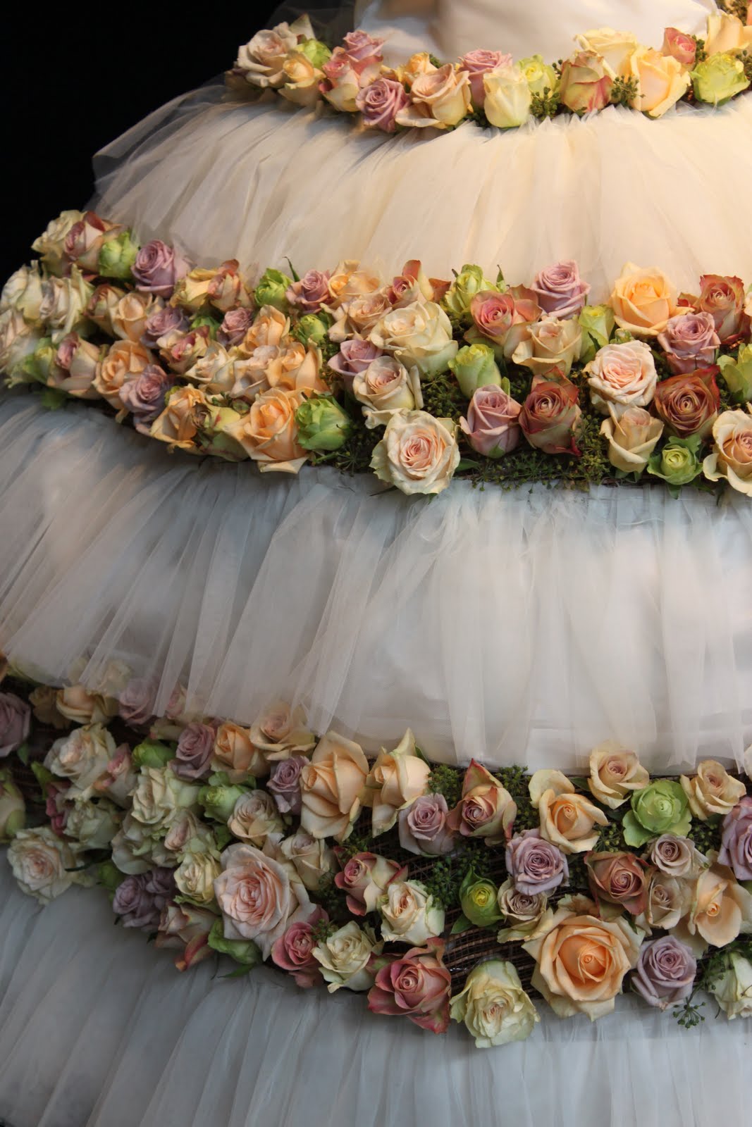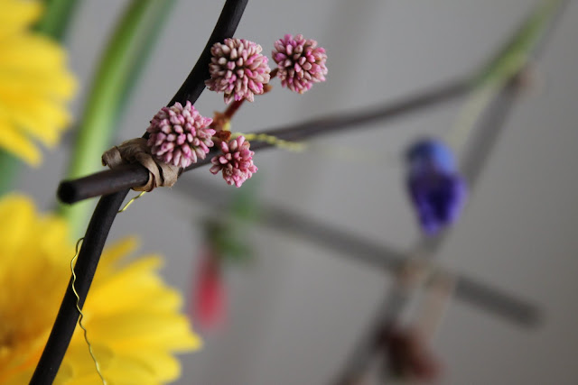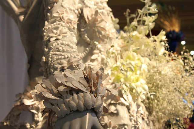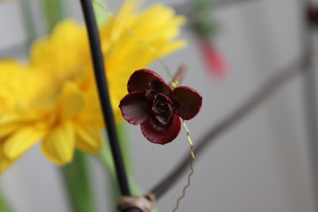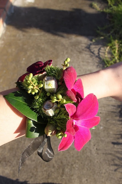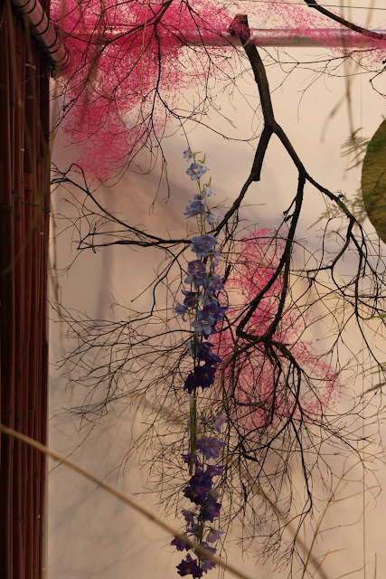 Iris, Gerbera, Chrysanthemum, Moss, Paperbark, Fern Stalks, flower chains with various flowers and leaves